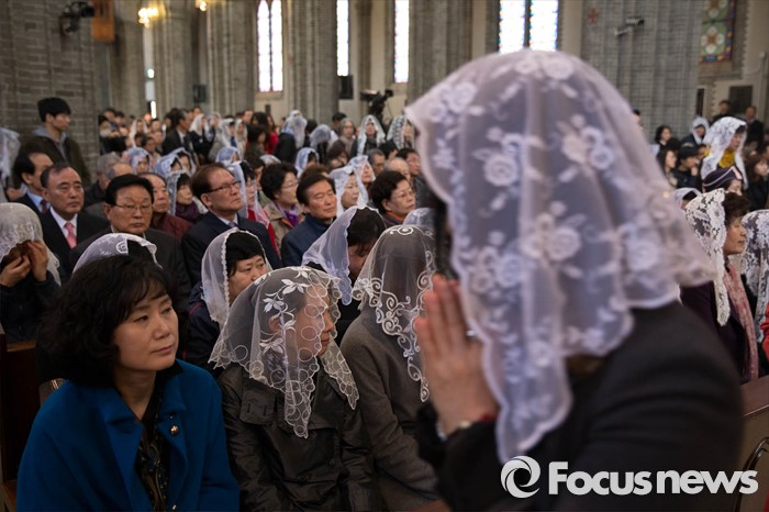 (서울=포커스뉴스) 부활절을 맞아 27일 정오 서울 중구 명동성당에서 열린 '예수 부활 대축일 미사'에 신도들이 참석해 있다.