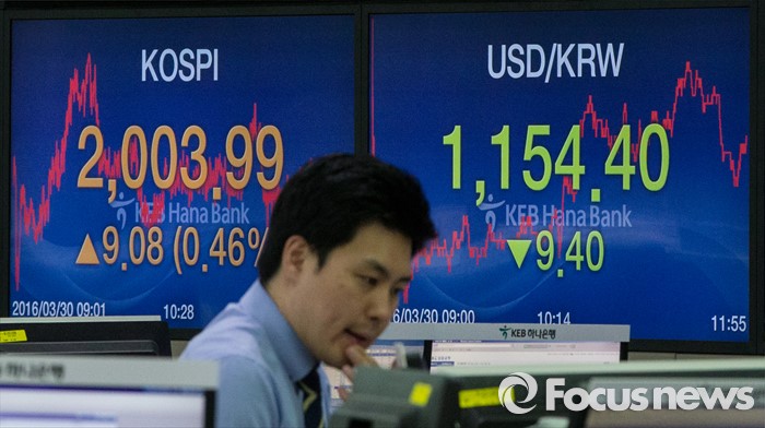 (서울=포커스뉴스) 30일 서울 중구 KEB외환은행 본점 딜링룸 전광판에 코스피 지수가 전일보다 9.08p (0.46%) 상승한 2003.99, 원달러환율은 전일보다 9.40원 하락한 1154.40원을 나타내고 있다. 이날 코스피지수는 재닛 옐런 미국 중앙은행(Fed) 의장의 비둘기파 발언에 힘입어 시가 기준 2000선을 돌파했다. 코스피가 시가 기준으로 2000선을 돌파한 것은 지난해 12월24일(2009.34) 이후 처음이다.
