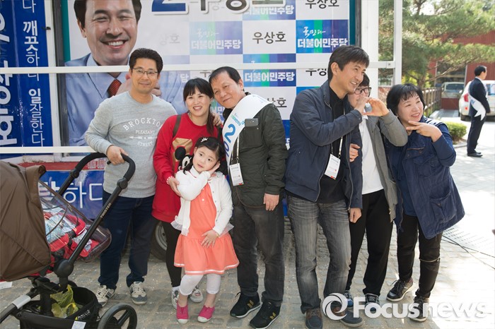 (서울=포커스뉴스) 11일 오후 서울 서대문구 청소년수련관 앞에서 영화배우 안내상, 우현씨가 우상호 더불어민주당 서대문구갑 후보를 지원하기 위해 시민들과 기념촬영을 하고 있다.