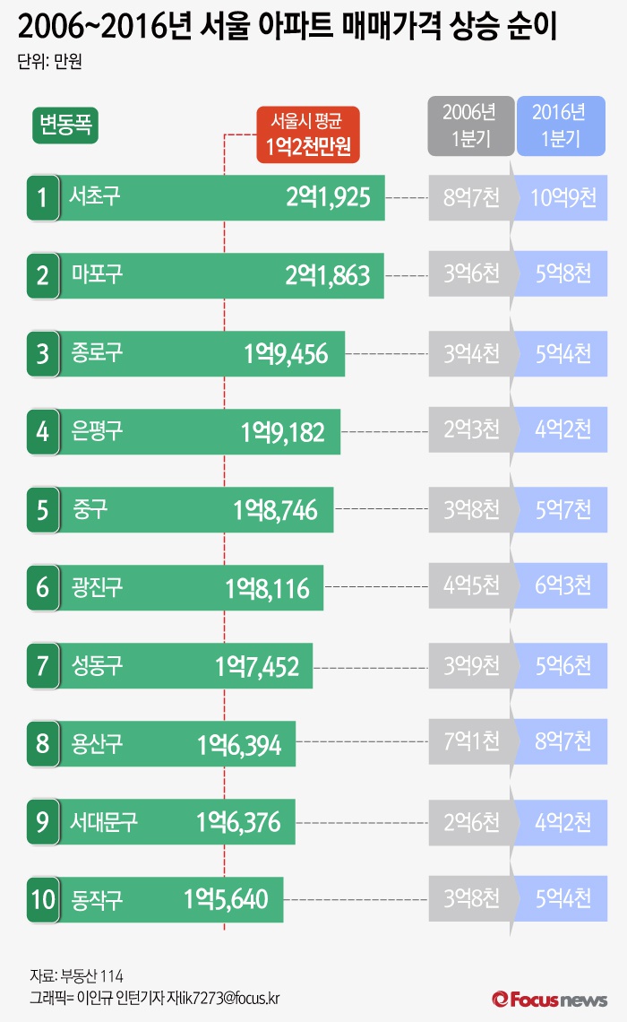 | △ [그래픽] 2006~2016년 아파느 매매가격 상승 순이 |