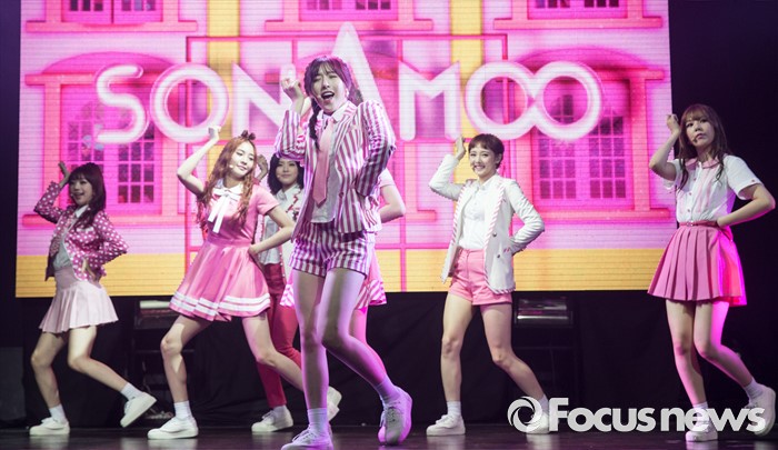 (서울=포커스뉴스) 29일 오전 서울 마포구 예스24 무브홀에서 열린 걸그룹 소나무의 미니앨범 '넘나 좋은 것' 쇼케이스에 참여한 멤버들이 신곡 '넘나 좋은 것'의 무대를 선보이고 있다.