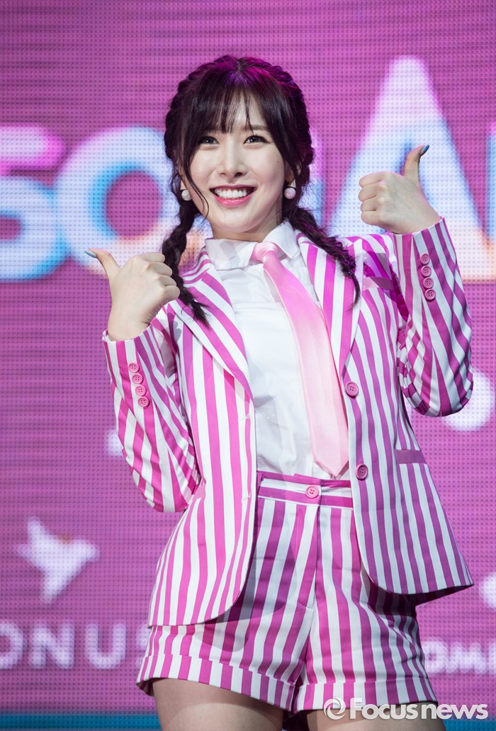(서울=포커스뉴스) 29일 오전 서울 마포구 예스24 무브홀에서 열린 걸그룹 소나무의 미니앨범 '넘나 좋은 것' 쇼케이스에 참여한 멤버 의진이 포토타임을 갖고 있다.