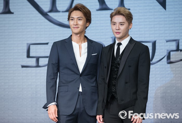 (서울=포커스뉴스) 11일 오후 서울 종로구 포시즌스호텔 서울에서 열린 뮤지컬 '도리안 그레이' 제작발표회에 참석한 배우 박은태(왼쪽)와 김준수가 포토타임을 갖고 있다.