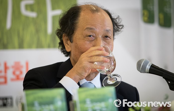 (서울=포커스뉴스) 조정래 소설가가 12일 오전 서울 중구 한국프레스센터에서 열린 '풀꽃도 꽃이다' 출간기념 기자간담회에서 한국 교육의 문제점을 말한 후 물을 마시고 있다.