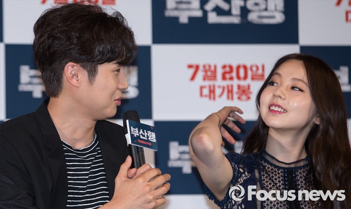 (서울=포커스뉴스) 12일 오후 서울 광진구 롯데시네마 건대입구점에서 열린 영화 '부산행' 언론시사회에 참석한 배우 최우식(왼쪽)이 취재진의 질문에 답하고 있다.