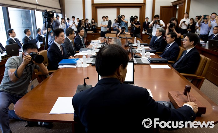 (서울=포커스뉴스) 14일 오전 서울 중구 한국은행에서 열린 제14차 금융통화위원회의에 참석한 이주열 한국은행 총재가 개회를 알리는 의사봉을 두드리고 있다.