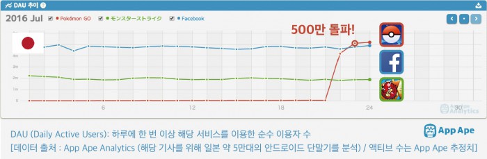 26일 시장조사업체 앱에이프(App Ape)가 현지 5만여대 안드로이드 운영체제(OS) 단말기를 분석한 결과, 포켓몬 고는 지난 22일 출시 첫날 일본의 국민 게임으로 불리는 '몬스터 스트라이크'의 사용자 수를 넘어선데 이어 23일 500만 DAU(하루 활성사용자수)를 기록하며 페이스북과 트위터를 넘어섰다.