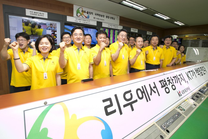 최한규 KT 네트워크운용본부장 상무는 “완벽한 국제방송중계망 운용을 위해 27일부터 대회가 종료되는 8월22일까지 비상근무체계에 돌입한다”며, “원정 응원단 등 브라질을 찾을 한국 관광객들을 위해 국제로밍과 국제인터넷 소통대책을 마련하는 등 무결점 통신 서비스를 제공할 계획”이라고 밝혔다.리우 올림픽 국제방송중계망 개통식에 참여한 KT 임직원들이 기념사진을 촬영하고 있다.<사진제공=KT>