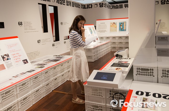 (서울=포커스뉴스) 28일 오후 서울 용산구 국립한글박물관에서 열린 기획특별전 '광고 언어의 힘' 언론 간담회에서 참석자들이 다양한 광고를 살펴보고 있다. 개화기부터 현재까지 광고의 130여년 역사를 우리말과 우리글의 관점에서 풀어낸 이 기획특별전은 7월 28일부터 11월 27일까지 열린다.