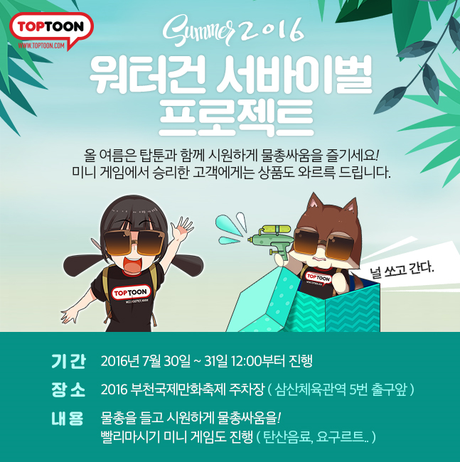 김춘곤 탑툰 대표는 "국내 최대 만화·웹툰 전문 축제인 부천국제만화축제에 협찬할 수 있게 되어 기쁘고 만화와 웹툰을 좋아하는 독자들을 위해 무더운 여름을 날릴 수 있는 워터건 서바이벌을 준비했다"면서 "많은 분들이 이 무더운 여름을 탑툰과 함께 시원하게 보낼 수 있으면 좋겠다"고 말했다.'워터건 서바이벌 프로젝트' 포스터.<사진제공=탑툰>
