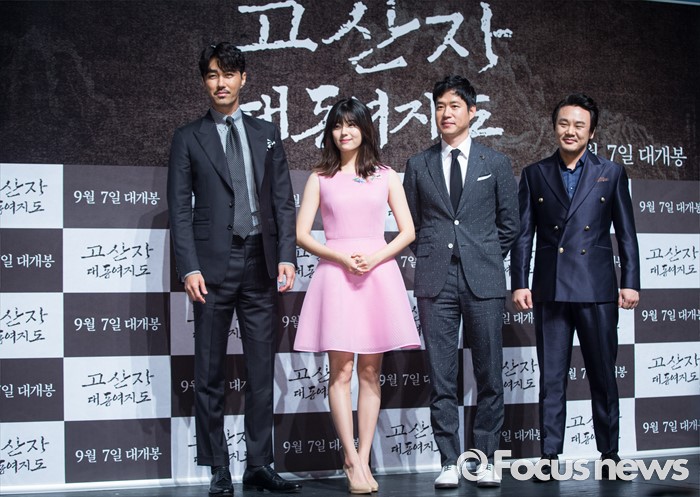 (서울=포커스뉴스) 9일 오전 서울 강남구 압구정 CGV에서 열린 영화 '고산자, 대동여지도' 제작보고회에 참석한 출연진이 포토타임을 갖고 있다. 왼쪽부터 배우 차승원, 남지현, 유준상, 김인권.