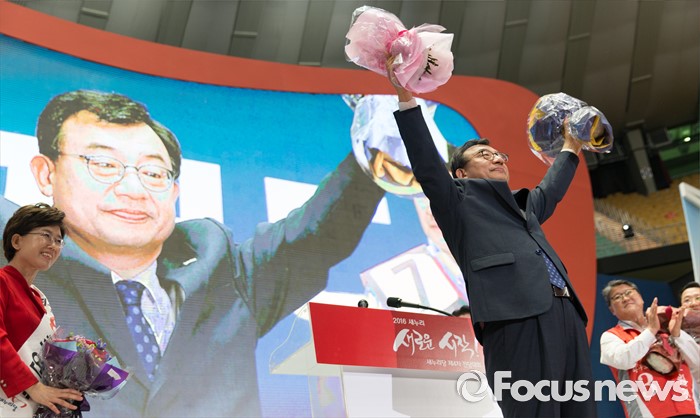 (서울=포커스뉴스) 9일 오후 서울 송파구 잠실실내체육관에서 열린 제4차 새누리당 전당대회에서 당대표로 선출된 이정현이 환호하고 있다.