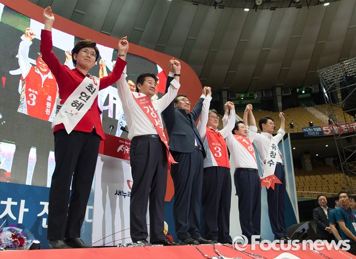 (서울=포커스뉴스) 9일 오후 서울 송파구 잠실실내체육관에서 열린 제4차 새누리당 전당대회에서 당대표 및 최고위원으로 선출된 의원들이 만세를 외치고 있다. 왼쪽부터 최고위원에 선출된 최연혜, 강석호, 이정현 대표, 조원진, 이장우, 유창수.