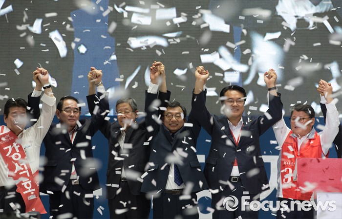 (서울=포커스뉴스) 9일 오후 서울 송파구 잠실실내체육관에서 열린 새누리당 4차 전당대회에 참석한 이정현 의원이 당대표로 선출된 후 김희옥 혁신비대위원장, 정진석 원내대표 등과 손을 들어 인사하고 있다.