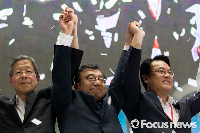 (서울=포커스뉴스) 9일 오후 서울 송파구 잠실실내체육관에서 열린 제4차 새누리당 전당대회에서 당대표로 선출된 이정현(가운데) 의원이 김희옥(왼쪽) 혁신비대위원장, 정진석(오른쪽) 원내대표와 만세를 하고 있다.