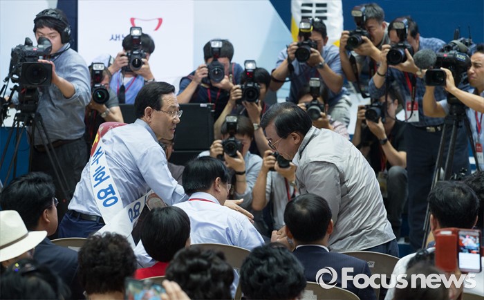 (서울=포커스뉴스) 9일 오후 서울 송파구 잠실실내체육관에서 열린 새누리당 4차 전당대회에 참석한 이정현(오른쪽) 의원이 당대표로 선출된 후 주호영(왼쪽), 이주영 의원 등에게 축하받고 있다.