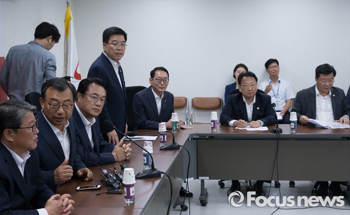 (서울=포커스뉴스) 11일 오후 서울 여의도 국회에서 열린 전기세 누진제 개편 긴급 당정 협의에 참석한 이정현 새누리당 대표, 정진석 원내대표, 유일호 경제부총리 겸 기획재정부 장관, 주형환 산업통상자원부 장관 등이 논의를 하고 있다.